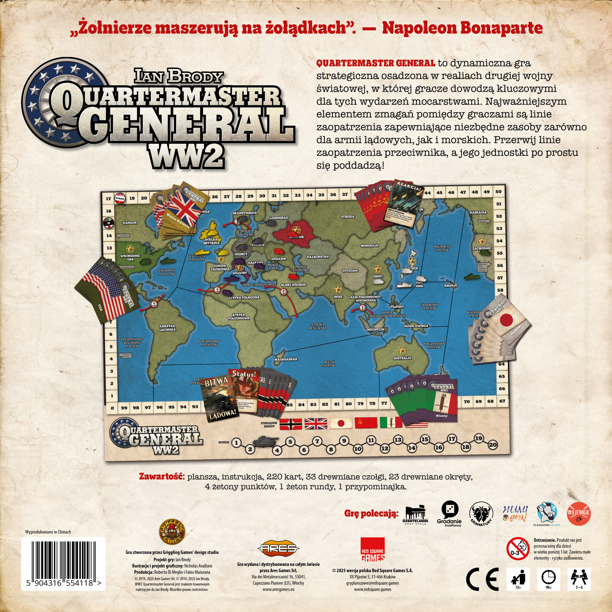 Quartermaster General: WW2 – Druga edycja to dynamiczna gra strategiczna osadzona w realiach drugiej wojny światowej, w której gracze dowodzą kluczowymi dla tych wydarzeń mocarstwami. Najważniejszym elementem zmagań pomiędzy graczami są linie zaopatrzenia zapewniające niezbędne zasoby zarówno dla armii lądowych, jak i morskich. Przerwij linie zaopatrzenia przeciwnika, a jego jednostki po prostu się poddadzą!
