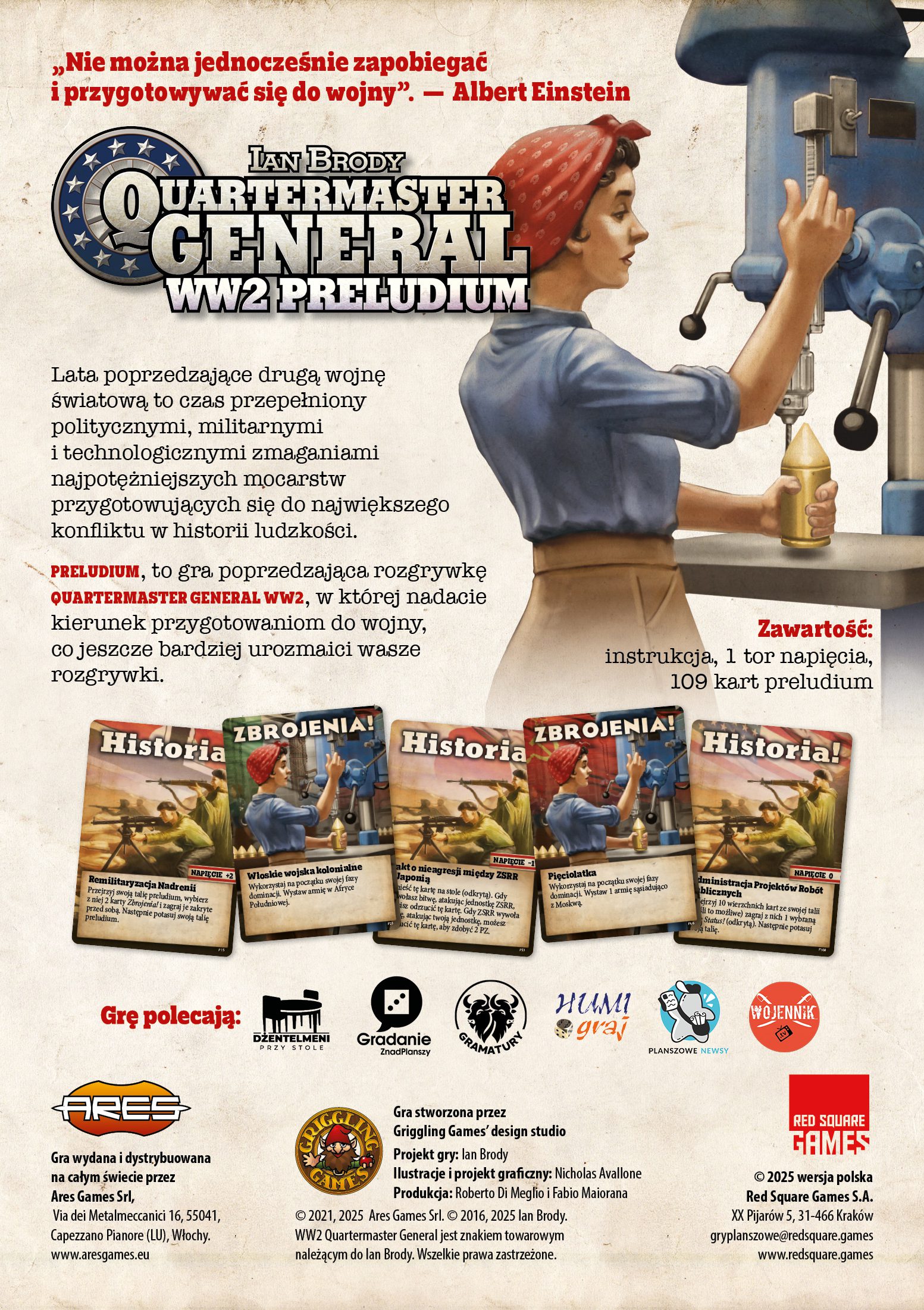 Preludium to dodatek do gry Quartermaster General: WW2, który rozszerza rozgrywkę o wydarzenia i decyzje z okresu poprzedzającego wybuch II wojny światowej. Wprowadza nowe karty i mechaniki, pozwalające graczom wpływać na układ sił jeszcze zanim konflikt ogarnie świat.