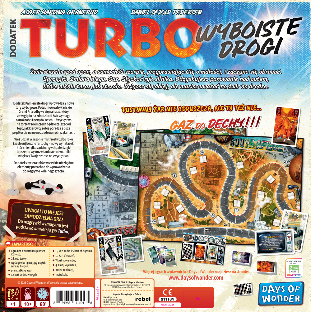 To ekscytująca gra planszowa, która przeniesie Cię na fotel kierowcy uczestniczącego w chaotycznych wyścigach z lat 60. Jej główny mechanizm to proste i intuicyjne zarządzanie kartami. Wybranie odpowiednich ulepszeń pozwoli Twojej wyścigówce na lepsze wchodzenie w zakręty, a także zapewni odpowiednie chłodzenie i utrzymanie największej możliwej prędkości. Ostatecznie jednak wszystko zależy od Twoich umiejętności!
